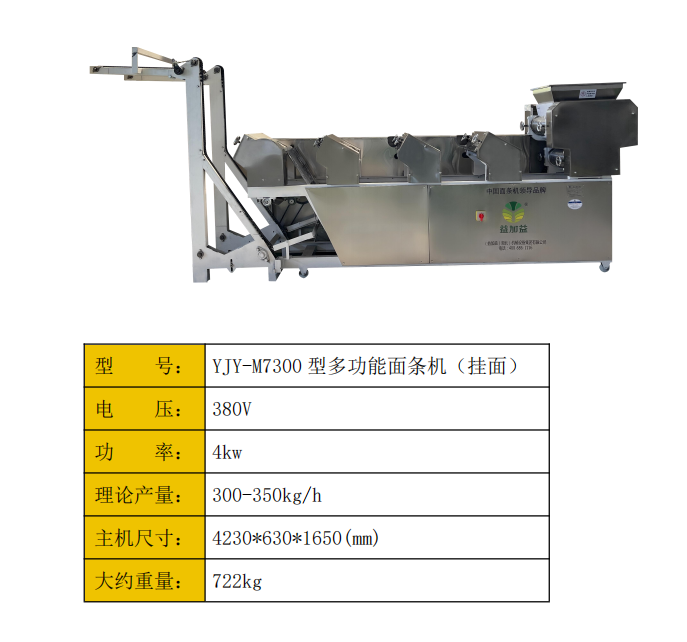 益加益集团研发生产的YJY-M系列面条机,是将传统模式和现代工艺相结合,经多次技术升级后推出的最新一代多功能自动面条机,整机外观精美、结构先进,操作方便,安全耐用,噪音低,效率高,省时省工。操作时只需将拌好的面放入机器,通过多道压面辊自动擀面,一次性成型面条。系列产品只需通过更换不同刀具可以生产:方形面条、圆形面条、刀削面、菱形面、挂面、饺子皮、热干面、混沌皮等;广泛适用于宾馆、饭店、机关、学校等单位食堂,食品加工厂及个体生产销售面食之用;我公司也可订为客户定制大型面条机。